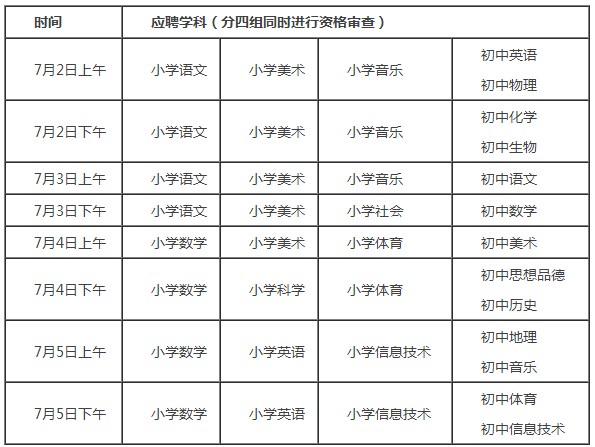 (二)资格审查分工。审查人员由教育局人员组成,资格审查分4组同时进行:第一组和第二组负责报考初中全部岗位和小学科学、小学美术、小学社会岗位的资格审查;第三组和第四组负责小学数学、小学体育、小学信息技术、小学音乐、小学英语、小学语文岗位的资格审查。