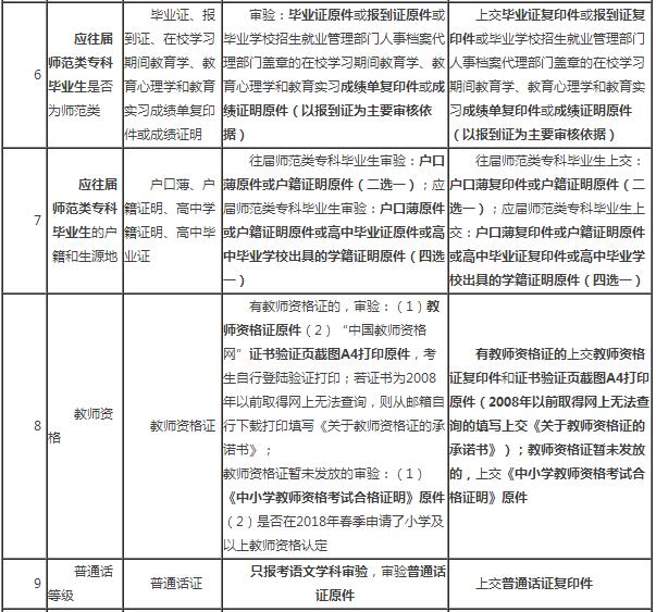 四、师范类专科毕业生相关情况说明:(1)全日制普通高校师范类专业专科毕业生资格审查时需提供本人户口本原件和复印件,或者户籍所在地公安部门出具的制式户籍证明,或者本人高中毕业学校出具的学籍证明或高中毕业证,不能提供者不得通过资格审查。(2)全日制普通高校专科毕业生毕业证书所学专业一栏无“教育”字样的,提供毕业报到证或者由毕业学校招生就业管理部门或人事档案代理部门盖章的在校学习期间教育学、教育心理学和教育实习成绩单复印件或成绩证明。