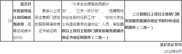 3、符合我省特岗计划招聘优惠政策,在笔试成绩中加5分的“大学生志愿服务西部计划”、“三支一扶计划”、“选聘高校毕业生到村任职工作”、“在校大学生士兵退役复学应届毕业”人员,需提供县级以上项目主管部门颁发的服务期满合格证书(或证明)原件和复印件。