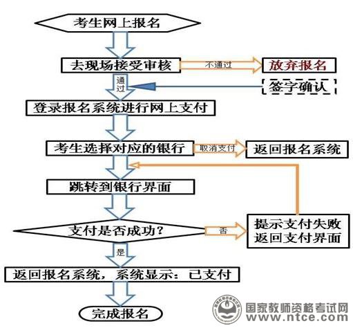 第五步,缴费。现场审核通过后,网上缴费确认截至日期前,考生可再次登录NTCE网上报名系统,查看审核结果并按照系统提示进行在线支付考试费(附面试网报在线支付流程图及在线支付银行列表)。缴费后考生可在网上报名系统中查询报名是否成功。未经审核或审核不通过的考生,不能网上支付考试费。逾期未在网上缴纳考试费的考生,报名系统将视其为放弃报考,并自动注销该生当次报考信息。