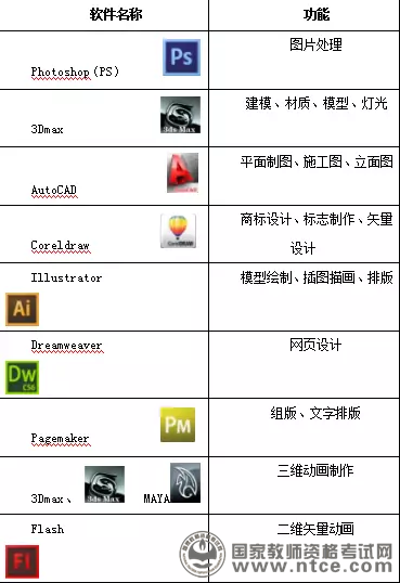A.photoshop B.dreamweaver C.3DMax D.flash 这一类的题目主要考查考生对于设计软件的掌握与操作情况,在招教考试中很多省份每年会必考两题,考生要了解不同的电脑设计软件的操作界面,操作属性和功能。对于学习专业绘画的考生来说有些困难,需要大家了解和熟悉的软件汇总如下图所示