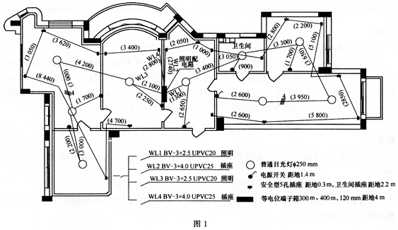 1.某市新建一单层民居,电气平面图见图1,图中标注尺寸以mm计,括号内标注数字为电线保护管水平敷设长度;