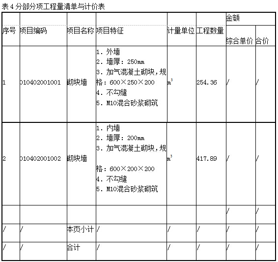 假设按题一条件计算出的清单工程量见表2: