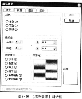步骤2单击【填充】设置区中的【颜色】列表框,在打开的下拉列表中选择【填充效果】,打开【填充效果】对话框,如图8-10所示。
