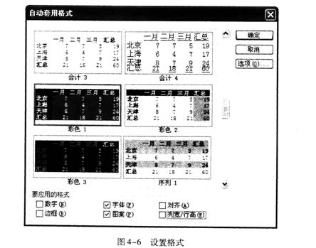 步骤3拖动滚动条,单击列表中的【彩色1】,单击【选项】按钮,出现【要应用的格式】设置区。取消其中已选中的【数字】复选框、【边框】复选框、【对齐】复选框和【列宽/行高】复选框,如图4-6所示。