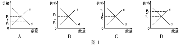 在供需平衡的某商品市场上,假设政府基于某种目标,决定对该商品实施价格上限管制政策,其他条件不变。图1(P1表示政策实施前价格,P2表示政策实施后价格)中能反映该政策实施后价格变动的是