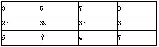 从每列来看,第二项是第一项与第三项之和的整数倍。27÷(3+6)=3,39+(5+8)=3,33÷(7+4)=3,32÷(9+7)=2。