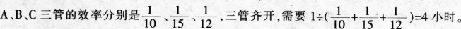 [答案]D.解析:由题意可知A管注水30分钟相当于B管注水45分钟,则二者效率之比为3:2.设A管效率为3x,B管为2x,则C管为(3x+2x)+2=2.5x.依题意有3×(3x+2x)+3×(2x+2.5x)+3x÷2:1,解得x=1/30.所以