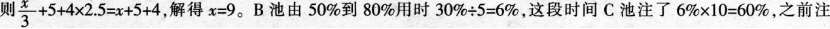有A、B、C三个水管分别向三个容积相同的水池注水.当8管注满50%池水时,C管注水量是B管的80%.此后A管调整注水速度为最初的1/3,C管注水速度增加1.5倍,三个管总注水速度不变.则B池注满80%时,C池还差( )注满。