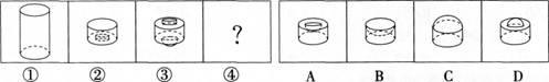 下图中的立体图形①是由立体图形②、③和④组合而成的,下列( )能够填入问号处。