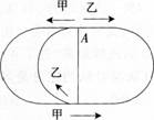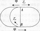 根据题意可知,甲、乙只可能在AB右侧的半跑道上相遇。易知小跑道上AB左侧的路程为100米,右侧的路程为200米,大跑道上AB的左、右两侧的路程均是200米。当甲第一次到达B点时,乙还没有到达8点,所以第一次相遇一定在B点右侧某处。而当乙跑完一圈到达A点需要300+4=75秒,甲跑了6×75=450米,在A点左边50米处。所以当甲再次到达B处时,乙还未到B处,那么甲必定能在B点右边某处与乙第二次相遇。从乙再次到达A处开始计算,还需(400-50)÷(6+4)=35秒,甲、乙第二次相遇,此时甲共跑了75+35=110秒,从开始到甲、乙第二次相遇甲共跑了6×110=660米,应选择C。