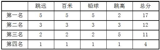 每个单项4人共得分5+3+2+1=11分,4个单项总分为11×4=44分,第一、三名得分为17、11分,则第二、四名得分之和为44-17-11=16分,其中第四名得分最少为1×4=4分,此时第二名得分最高,为16-4=12分;又因为第三名为11分,那么第二名只能为12分,此时第四名4分。于是,第一、二、三、四名的得分依次为17、12、11、4分,而17只能是5+5+5+2,4只能是1+1+1+1,不难得到下表: