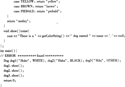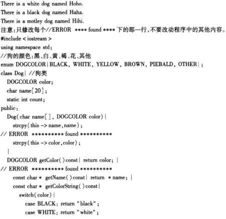 请使用VC6或使用【答题】菜单打开考生文件夹proj1下的工程proj1,其中有枚举DOGCOLOR、狗类Dog和主函数main的定义。程序中位于每个“//ERROR*****found*****”下的语句行有错误,请加以改正。改正后程序的输出结果应该是: