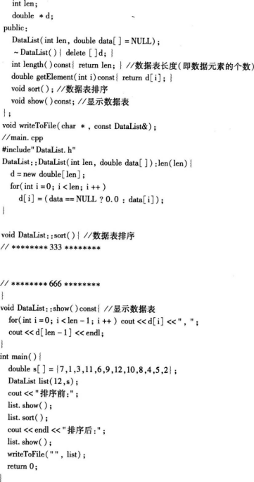 请使用VC6或使用【答题】菜单打开考生文件夹p,oj3下的工程proj3,其中声明的DataList类,是一个用于表示数据表的类。sort成员函数的功能是将当前数据表中的元素升序排列。请编写这个sort函数。程序的正确输出应为: