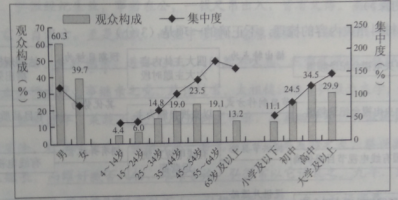注:群众构成反映的是收拾人群的构成,回答了“谁在看频道”的问题,集中度是目标群众收视率与总体群众收视率的比值,表示的是目标群众相对于总体群众的收拾集中程度,能够回答“谁更喜欢收看这个频道”的问题;集中度的比值大于100%,表示该类目标群众的收拾倾向高于平均水平。