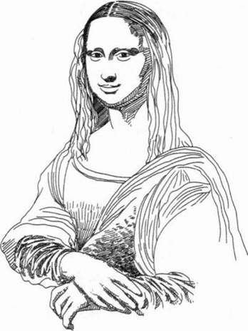 以线描形式描绘达·芬奇的作品《蒙娜丽莎》的大体形象。