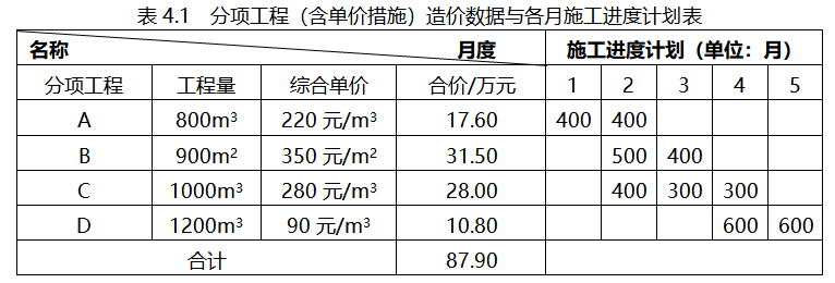 (1)分项工程(含单价措施)项目费用87.90万元,包括A、B、C、D四项。费用数据与施工进度计划如表4.1。