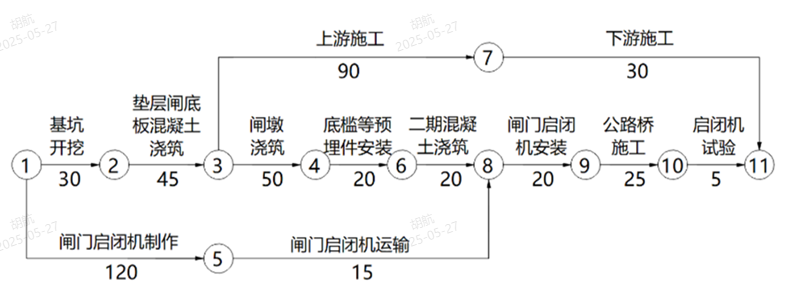 事件四:闸门及启闭机安装实际持续时间为15天:公路桥施工实际持续时间为20天:按规范要求,启闭机在现场进行了空载等试验,试验持续时间为4天。