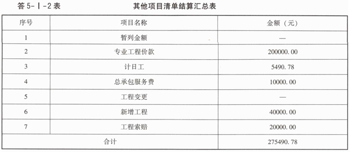 3.该项目合同中约定的暂列金额为10万元,在实际结算时,承包商工程索赔费用2万元,新增工程费用4万元,专业工程价款20万元,总承包服务费10000万元,计日工10个工日,工日单价为180元/工日,水泥2.6t,综合单价为410元/t;中砂10m³,综合单价为220元/m³,灰浆搅拌机(400L)2个台班,台班含税单价为30.50元/台班(税率按13%),列式计算实际结算的计日工费用,并编制其他项目清单结算汇总表(题5-I-3表)。(计算结果保留两位小数)