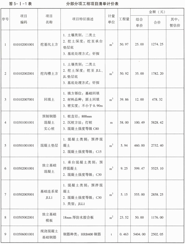 2.某承包商投标并中标,该承包商的企业管理费、利润按人工费、机械费之和的20%计,利用问题1的计算结果和以下相关数据,列式计算承台独立基础混凝土、钢筋工程的综合单价,并编制题5-I-2表。相关数据如下: