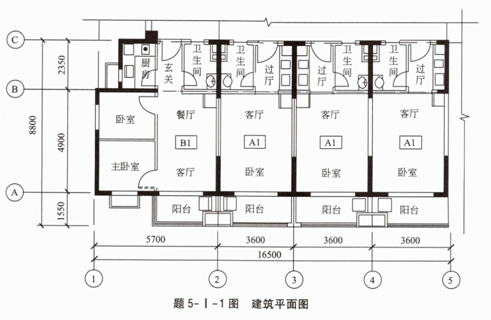某剪力墙结构住宅,剪力墙厚200mm,标准层建筑平面由A1户型和B1户型组成,详见题5-I-1图。客厅、餐厅、卧室楼板采用桁架混凝土叠合板,混凝土采用C30。