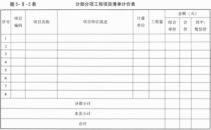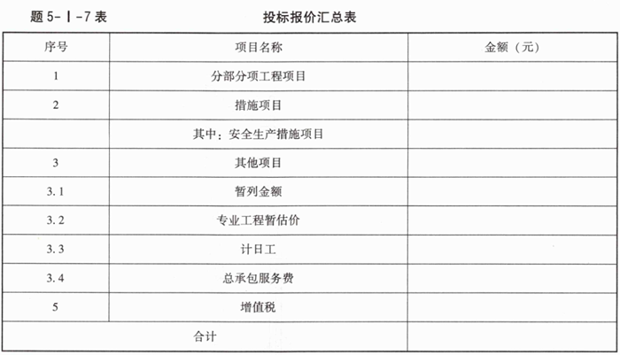 4.假定某施工企业拟投标该工程,计算得出该工程的分部分项工程费为1275293.74元(其中,人工费、机具使用费占比为25%),措施项目费为219414.62元(其中,安全生产措施费按分部分项费用中人工费、机具费之和的1.5%计),其他项目费用为:暂列金额250000元,专业工程暂估价50000元,总承包服务费可按不含税专业工程暂估价的4%计取,计日工60工日,每工日综合单价按200元计。增值税税率均按9%计,补充完成该工程的投标报价汇总表(题5-I-7表)。