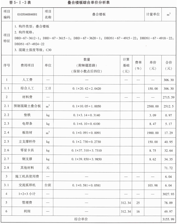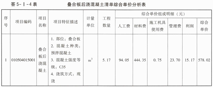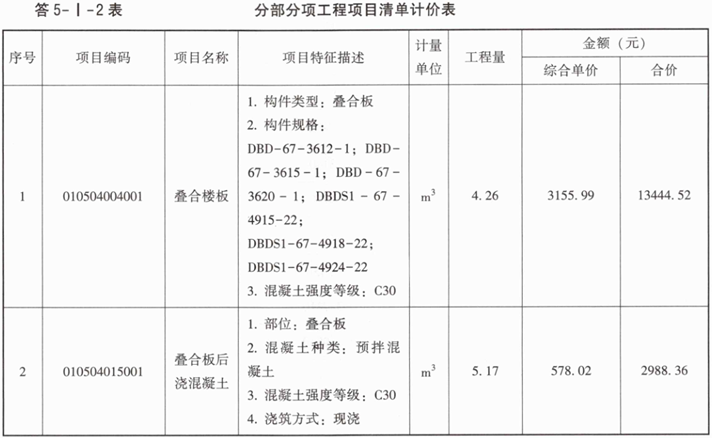 3.填写完成题5-I-5表、题5-I-6表中叠合板与后浇混凝土的综合单价分析表。