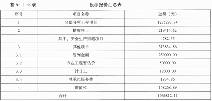 4.假定某施工企业拟投标该工程,计算得出该工程的分部分项工程费为1275293.74元(其中,人工费、机具使用费占比为25%),措施项目费为219414.62元(其中,安全生产措施费按分部分项费用中人工费、机具费之和的1.5%计),其他项目费用为:暂列金额250000元,专业工程暂估价50000元,总承包服务费可按不含税专业工程暂估价的4%计取,计日工60工日,每工日综合单价按200元计。增值税税率均按9%计,补充完成该工程的投标报价汇总表(题5-I-7表)。