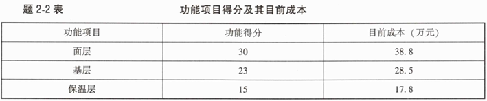 2.为进一步控制工程造价,拟以所选的最优设计方案的某分部分项工程费用为对象开展价值工程分析。分为三个功能项目,各功能项目得分值及其目前成本见题2-2表,按限额和优化设计要求,目标成本额应控制在80万元。