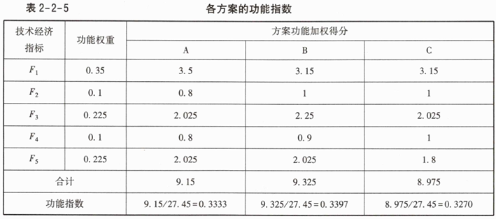 2.列表计算各方案的功能指数,将计算结果填入表2-2-3中。