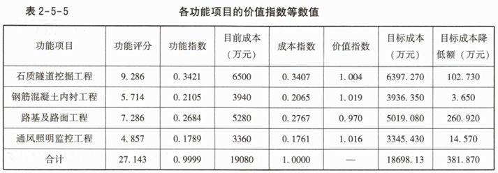 4.成本降低额从大到小排序为路基及路面工程、石质隧道挖掘工程、通风照明监控工程、钢筋混凝土内衬工程。所以功能改进的前两项分别为路基及路面工程、石质隧道挖掘工程。