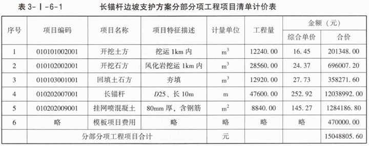 3.已知C22a通长槽钢腰梁综合单价为435.09元/m、C25毛石混凝土填充综合单价为335.60元/m³,模板项目费用测算结果为340000.00元。根据问题1和问题2的计算结果,以及表3-I-6-1中相应的综合单价、答题卡表中相关的信息,按现行国家标准《房屋建筑与装饰工程工程量计算标准》GB/T50854—2024的计算规则,在答题卡表3-I-6-5中,编制该预应力长锚索边坡支护方案分部分项工程项目清单计价表。