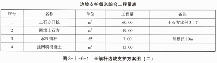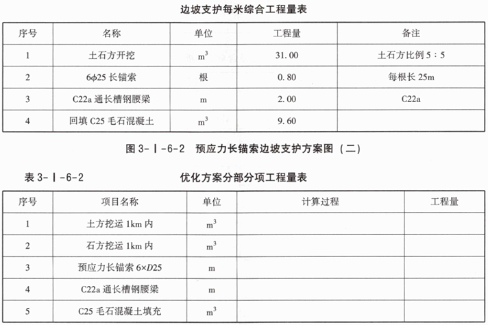 1.根据图3-I-6-2中相关数据,按现行国家标准《房屋建筑与装饰工程工程量计算标准》GB/T50854—2024的计算规则,在答题卡表3-I-6-2中,列式计算该预应力长锚索边坡支护优化方案分部分项工程量(土石方工程量中土方、石方的比例按5:5计算)。