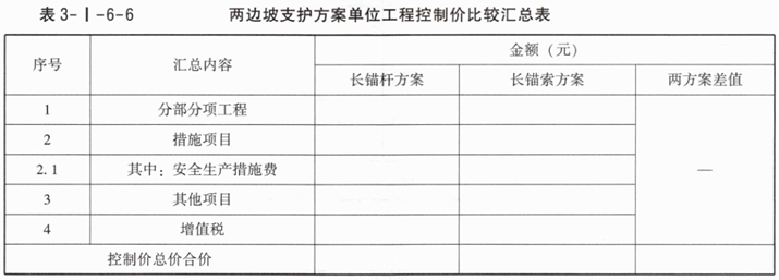 4.若措施费仅有安全文生产措施项目费,长锚杆方案安全生产措施项目费为874828.34元,长锚索方案安全生产措施项目费为606135.00元,其他项目费用为零,增值税税率按9%计取。利用表3-I-6-3和问题3相应的计算结果,按《建设工程工程量清单计价标准》GB/T50500—2024的计算规则,在答题卡表3-I-6-6中,编制两边坡支护方案单位工程控制价比较汇总表(两方案差值为长锚杆方案与长锚索方案控制价的差值)。(无特殊说明的,费用计算时均为不含税价格。)