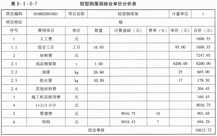 (2)轻型钢屋架综合单价分析表见表3-I-3-7。