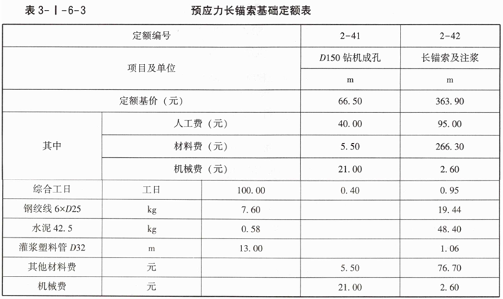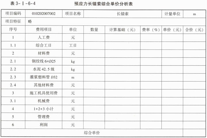 2.若企业管理费按人工、材料、机械费之和的10%计取,利润按人工、材料、机械、企业管理费之和的7%计取。根据表3-I-6-3中的数据,按现行国家标准《建设工程工程量清单计价标准》GB/T50500—2024的计算规则,在答题卡表3-I-6-4中,编制该预应力长锚索综合单价分析表[预应力长锚索工程量计量方法,基础定额与清单规范相同,均按设计图示尺寸,以长度(m)为单位]。