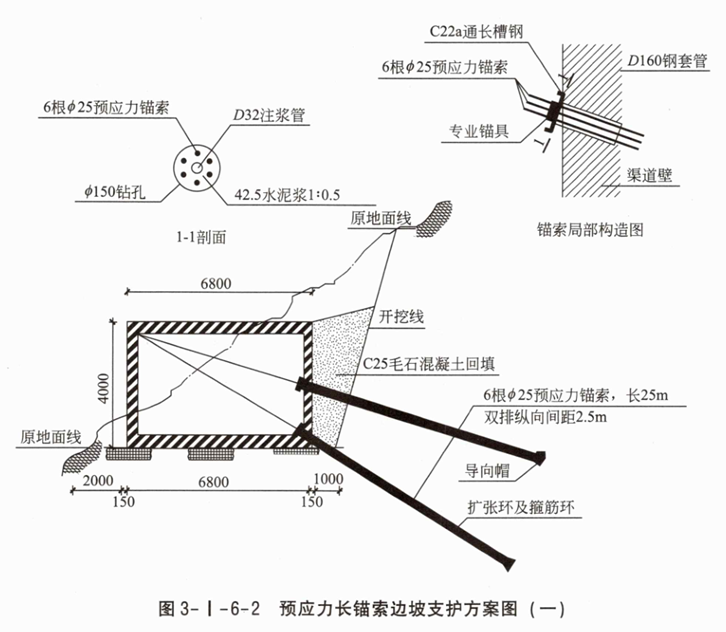 1.本设计为尾矿库排洪渠道土方开挖边坡支护预应力长锚索(25m)方案。