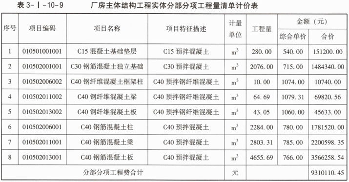 3.根据问题1、问题2的计算结果,以及表3-I-10-1中已有的数据和下面的已知信息,按《建设工程工程量清单计价标准》GB/T50500—2024的计算规则,在答题卡表3-I-10-5中编制该厂房主体结构工程实体分部分项工程项目清单计价表,经计算C40钢纤维混凝土框架柱及钢纤维混凝土板的综合单价分别为1074.00元/m³和1060.00元/m³。