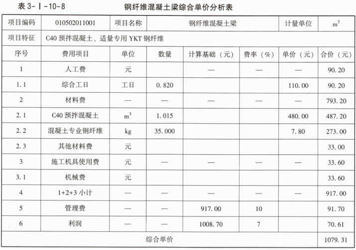 2.根据问题1的有关计算结果、表3-I-10-2给定的基础数据和下面的已知信息,按《建设工程工程量清单计价标准》GB/T50500—2024的计算规则,在答题卡表3-I-10-4中编制钢纤维混凝土梁综合单价分析表,已知企业管理费按人工费、材料费、机械费之和的10%计取,利润按人工费、材料费、机械费、企业管理费之和的7%计取。