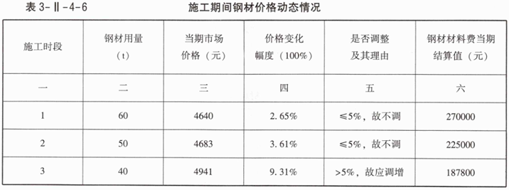 (2)第3时段钢材材料费当期结算值:40×[4500+(4941-4520×1.05)]=187800(元)
