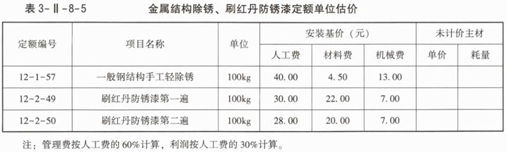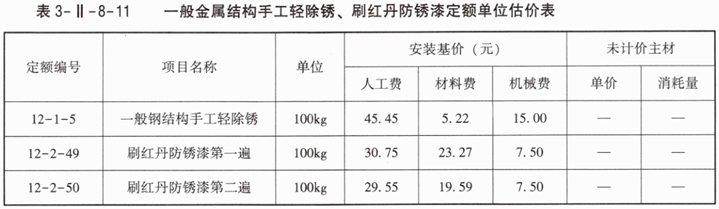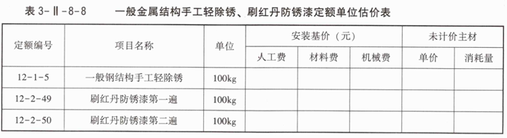 3.根据背景资料4编制一般金属结构手工轻除锈、刷红丹防锈漆定额单位估价表,并把编制结果填写到表3-Ⅱ-8-8中。
