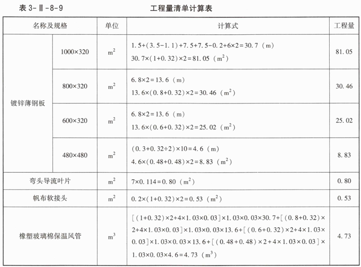 1.根据《通用安装工程工程量计算标准》GB/T50856—2024的规定,以及图3-Ⅱ-8-1所示内容和背景资料2,分别列式计算镀锌薄钢板、弯头导流叶片、帆布软接口、橡塑玻璃棉保温风管的清单工程量,并把计算式和计算结果填入表3-Ⅱ-8-6中。