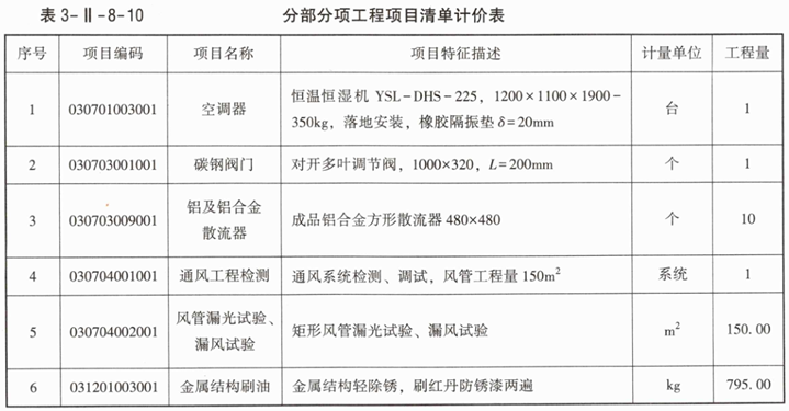 2.假设风管工程量为150m²,风管支吊架、托架、法兰等普通金属结构工程量为795kg,其他工程量按给定的图纸计算,根据《建设工程工程量清单计价标准》GB/T50500—2024和《通用安装工程工程量计算标准》GB/T50856—2024、图3-Ⅱ-8-1、背景资料3,编制空调器、碳钢阀门、铝及铝合金散流器、金属结构刷油、通风工程检测、风管漏光试验与漏风试验的分部分项工程项目清单,并把编制结果填写到表3-Ⅱ-8-7中。
