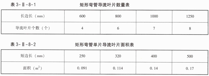 2.铝合金方型散流器(规格480×480)和多叶调节阀为成品购买,各种规格矩形弯管导流叶片数量见表3-Ⅱ-8-1,矩形弯管单片导流叶片面积见表3-Ⅱ-8-2。