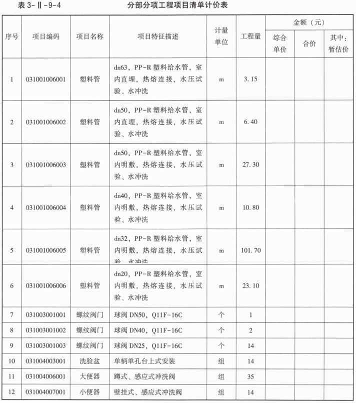 解析:1.计算卫生间给水管道安装项目分部分项清单工程量: