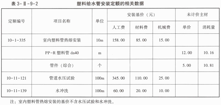 3.dn40PP-R室内明敷塑料给水管道安装综合单价=[158.00+85.00+15.00+158.00×(60%+30%)+10.16×12.00+10.81×5.00]÷10+[345.00+110.00+25.00+345.00×(60%+30%)]÷100+[60.00+20.00+10.00+60.00×(60%+30%)]÷100=67.97(元/m)