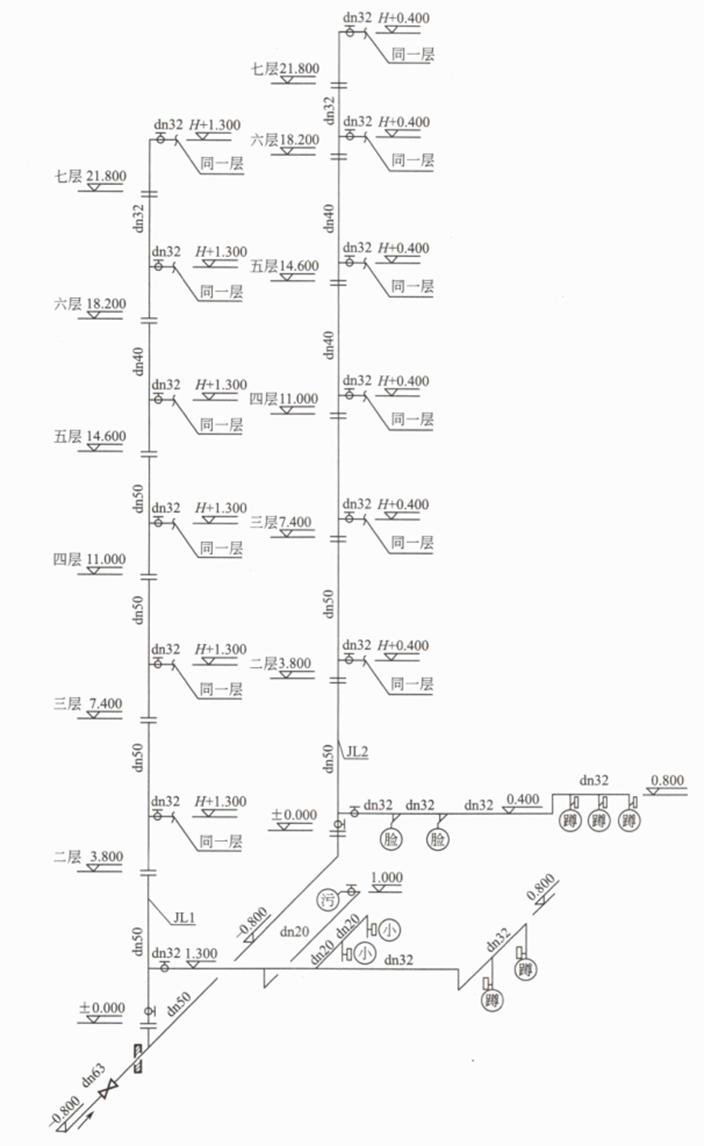 JL1支管:[(1.50+4.50-0.15×2)+(0.70+0.90-0.15)+(1.30-0.8)]×7=53.55(m)