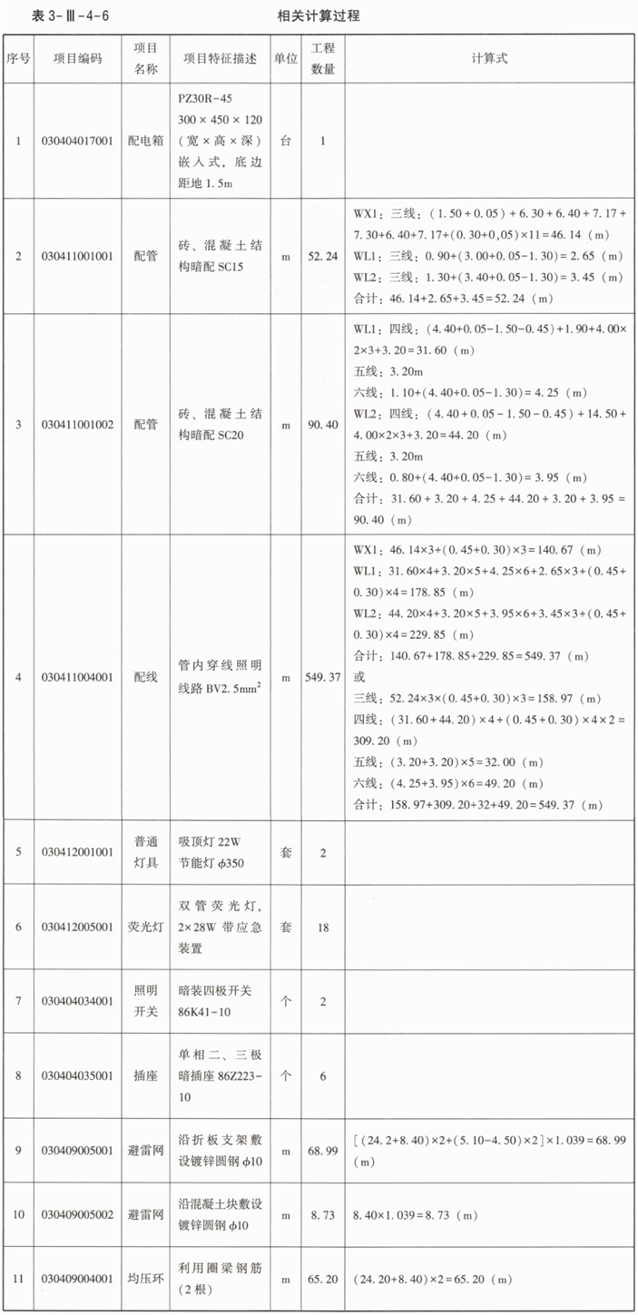 解析:1.根据现行国家标准《通用安装工程工程量计算标准》GB/T50856—2024的规定,列表计算配管(SC15、SC20)、配线(BV2.5mm²)、避雷网及均压环的清单工程量,计算过程见表3-Ⅲ-4-6。