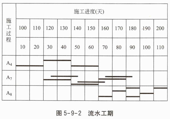 受网络计划逻辑关系的约束,流水工期为110天,见图5-9-2。