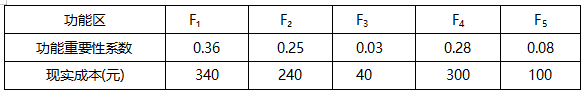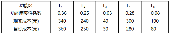 根据各功能区的重要性系数和目标总成本(1000元),分别计算各功能区的目标成本,如下表。凡现实成本大于目标成本的功能区(F